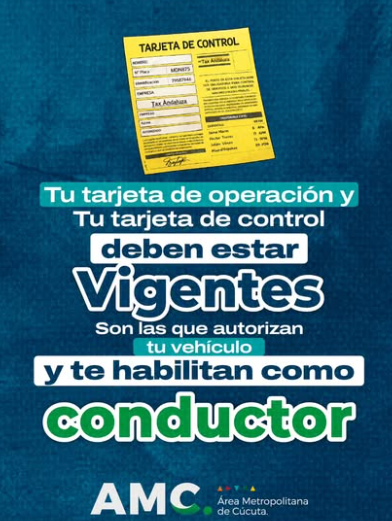 El Área Metropolitana de Cúcuta recuerda a todos los conductores del servicio de transporte público la importancia de mantener actualizadas y vigentes tanto la tarjeta de operación del vehículo como la tarjeta de control.